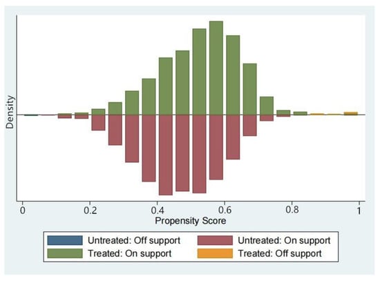 Table 3 shows that after the propensity score matching, the standardized deviation for most covariates was reduced, the bias values of the matched samples were significantly less than 10%, and the p-values were all greater than 0.1, which indicated that the matched treatment and control groups had no systematic differences and satisfied the balance test. As can be observed in Figure 3, there were few out-of-support untreated samples and most observed values for the samples were supported. Therefore, it was appropriate to use the PSM method because the results were reliable. After deleting the samples that were off the common support domain, the DID model was then applied to precisely estimate the HSR impact.