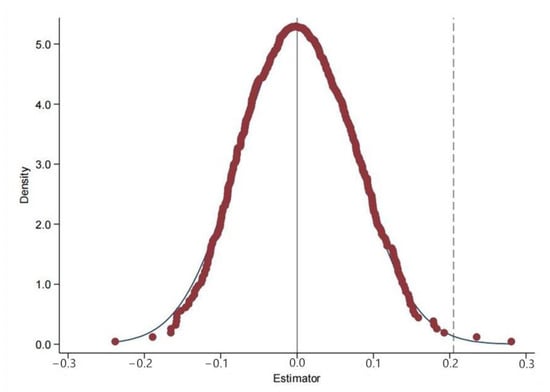 Figure 4 shows the empirical cumulative distribution function and density for the estimated HSR accessibility coefficients. The estimated coefficients for the HSR accessibility placebo variable were distributed around zero. However, the real estimated value of the benchmark was 0.206, as shown in column (6) in Table 4. The benchmark HSR accessibility estimate coefficients clearly lay outside the range of the coefficients estimated for the virtual HSR accessibility. This placebo test method has been widely used in DID processing studies [,].