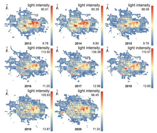 The light intensity of the built-up area of Zhengzhou city masked by light intensity thresholds from 2013 to 2020.