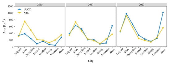 The mean value approach was utilized in GEE to generate annual composite NTL images from 2013 to 2020, and the OTSU algorithm was used to compute light thresholds for built-up regions in cities in the Yellow River Basin in different years. Because of the Yellow River Basin’s large spatial span, the light characteristics of different regions in different years are affected differently by climate and human activity images, so the light thresholds of urban built-up areas were calculated by region and year to extract the urban built-up area boundaries. The NTL results of the built-up region of each provincial capital city derived using the OTSU technique were validated using impervious layer and man-made surface data (LUCC) from ground cover categorization data from 2015, 2017, and 2020 (Figure 3). The NTL extraction results correlate well with the LUCC data, with R values larger than 0.8. The results show that the built-up areas retrieved in the GEE using the OTSU algorithm are highly accurate and may be used to study the expansion pattern of urban built-up regions.