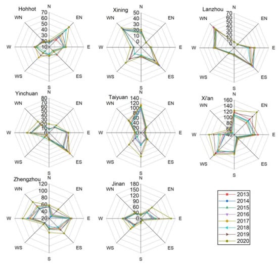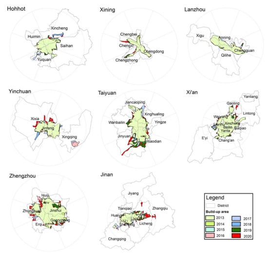 From 2013 to 2020, the built-up area in eight directions was evaluated to show the expansion direction of different cities’ built-up areas (Figure 5). During the period 2013–2020, the urban area of Xining expanded primarily westwards and southwestwards around the east–west axis; the urban area of Lanzhou did not expand significantly during this period; the urban area of Yinchuan expanded northwards and westwards around the “southeast–northwest” axis; the urban area of Hohhot expanded noticeably in the northeast direction; the urban area of Taiyuan expanded significantly southwards and southwestwards mainly around the “east–west” axis, with a slight change in the built-up area in the northern area; Xi’an expanded on both sides of the “northwest–southeast” axis, with the largest expansion in the northeast and west directions; the built-up area of Jinan expanded mainly in the east and northeast regions, with a slow expansion in the southwest; the built-up area of Zhengzhou expanded outwards in a “pancake” pattern, with a larger area growth in the northwest and southeast directions.