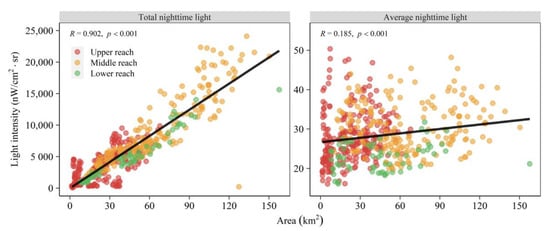 The capital cities of the Yellow River Basin are located along the upper, middle, and lower reaches of the river, with the built-up area steadily increasing from the upper to the lower reaches. Average nighttime light intensity (ANTL) and total nighttime light intensity (TNTL) data from urban built-up areas were divided into quadrants by upstream, middle, and downstream; they were studied to determine their correlation with urban built-up areas. The TNTL and the built-up area (AREA) had a significant positive correlation, with a correlation coefficient R = 0.902 (Figure 6). The ANTL was also positively correlated with AREA, but the correlation was weaker, with a correlation coefficient R of only 0.185.