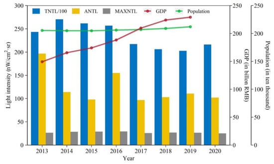 Changes in light intensity and GDP and population in Lanzhou from 2013 to 2019.