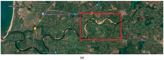 The digital elevation model (DEM) shows that the lower Deduru Oya river basin has almost flat terrain compared to the upland area, which could be a reason for the frequently observed river meandering. Furthermore, the downstream area of the river is facing the problem of erosion and could undergo the possible exposure of bridge foundations at the outer banks and accretion of sediment at the inner banks (see the area in the red square in Figure 1a). In addition, much damage to the infrastructure due to eroded banks can be easily observed (see Figure 1b). Furthermore, the meandering bend and its sand deposition can be clearly seen in Figure 1c. These were observed by the authors during their field visits to the area.