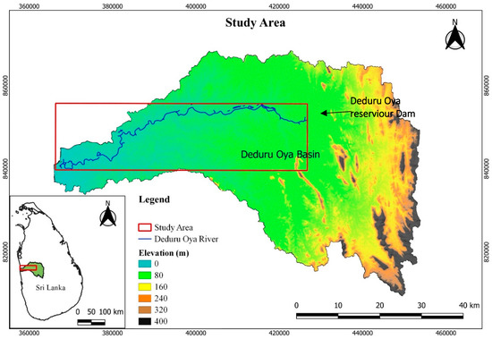 Sri Lanka is a water-rich country that has 103 major river basins. The Deduru Oya is one of the major rivers in Sri Lanka, originating in the Western part of the central highlands (in Matale and Kandy districts) and reaching the Indian Ocean on the west coast of Sri Lanka near the Chilaw urban area. Nearly 97% of the river basin lies in the northwestern province and only 3% belongs to the central province [26]. The basin is located in the intermediate agro-climatic zone. Based on the terrain features, the catchment of the Deduru Oya is categorized into two classes: uplands and lowlands. The mainstream of the river has a length of 115 km and an annual discharge of 1608 million cubic meters (MCM) into the sea [27,28]. The average annual rainfall received by the catchment is 1609 mm and the maximum amounts are recorded in October and November [28].