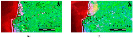 Illustrative maps of meandering features of the Deduru Oya using Landsat data: (a) for 2008—Landsat false color composite bands on LT05_L1TP_142055_20081229_20200828_02_T1_B (1, 4, 7); (b) for 2010—Landsat false color composite bands on LT05_L1TP_142055_20100218_20200824_02_T1_B (1, 4, 7).