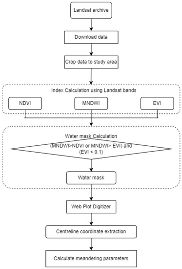 A semi-automated digitizing software package called WebPlotDigitizer version 4.5 [34] was used to extract the river centerline coordinates from the water mask images. After importing the 2D water mask image to the WebPlotDigitizer, it was calibrated using the axis coordinates of a few selected known points. The software allows the user to perform the digitization manually or using automatic digitization algorithms. There are several automatic extraction algorithms available in the software for extracting a large number of data points within a short time. In our study, we used the averaging window method as the automatic extraction algorithm. Then, these automatically extracted points were adjusted manually to fit them to the actual river by comparing the background image of the water mask and the points generated by the automatic extraction algorithm. Finally, the extracted points were saved as comma-separated value (.csv) files and these data were used to calculate the geometric parameters for the channel. A brief overview of the overall methodology followed in the study is presented in Figure 4.