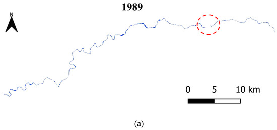 The river masks extracted based on the three indices described in Section 3.3 are presented in Figure 5 (data only shown for 1989, 2005, and 2021). The results indicated that the river masks in some images did not have continuous connections (see the dashed red circles). This can be attributed to the misclassifications that occurred due to the low resolution of the satellite images and the possible cloud cover in some images. The selected river segment of the Deduru Oya has a river width of about 50 m upstream and 200 m near the outlet. However, the resolution of Landsat 5 and Landsat 8 images is 30 m. Therefore, the representation of the river was difficult for the narrow sections. This was one of the major limitations of our study of the morphology of the Deduru Oya. Further, this limitation could also have reduced the accuracy of the delineated river planform. Misclassifications due to the mixture of water, sediment, and vegetation can also cause erroneous water mask classifications.