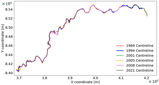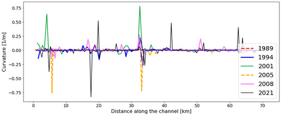 The spatial distributions for the river curvature for the six analyzed years are shown in Figure 7. The figure clearly shows the possible meander bends and their locations along the river centerline. In addition, the values for the curvature give an idea of the meandering sinuosity. When analyzing the temporal changes in the river curvature, the highest degree of curvature in the bends was observed in the years 2021 and 2005, while the lowest bend curvature values were observed for 1989. These curvature estimates were used to separate the individual bends.