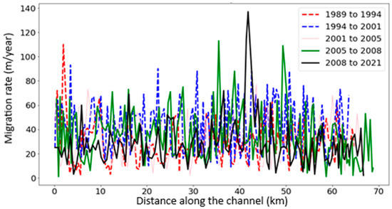 The rate of total migration along the channel was plotted and the graph is presented in Figure 8. This was used to identify the variations in the migration rates on the spatial and temporal scales.