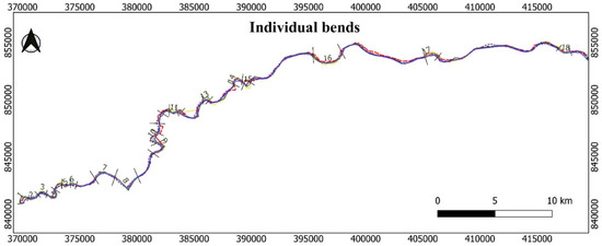 The bends detected in Figure 9 were compared with these different modes of meandering loop development described in the literature and classified by visually inspecting the changes in the river channel during the selected period. These results are shown in Table 3.