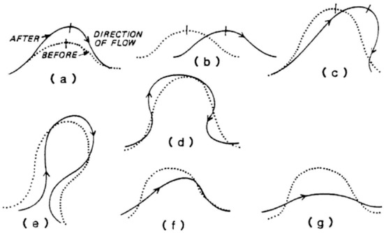 Different types of bend migrations: (a) extension; (b) translation; (c) rotation; (d) conversion to a compound loop; (e) neck cutoff by closure; (f) diagonal cutoff by chute; (g) neck cutoff by chute (extracted from Lagasse [36]).