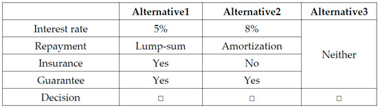 Since the mainstream supply of FMRM products are designed in the short-term in the prevailing market, we did not include the term of the loan attribute in the FMRM product, i.e., a short-term product (less than 1 year) vs. medium- (over 1–3 years,) or long-term products (over 3 years), individuals’ preferences may vary largely when selecting them. In future research, if the FMRM product is to be scaled, this attribute can be included when the medium- or long-term FMRM products are launched. Another consideration is the inclusion of the FMRM supplier in the attribute. Different suppliers (e.g., financial institutions) would provide distinct products and services that affect individuals’ decision-making.