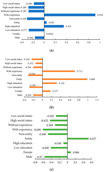 Figure 3a–c reports the estimated results of the mean WTP of different attributes across gender, education, agribusiness entity, loan experience, and social status, as well as 95% confidence intervals derived from the estimated RPL. The heterogeneities in farmers’ preferences for selecting FMRM attributes are apparently across their characteristics, especially for gender, agribusiness entity, and loan experience. First, it is indicated that the female farmers with high education levels, entity identities, and loan experiences were more willing to pay off their loans at once. In precisely, they were willing to pay a 0.0005%, 0.351%, 0.043%, and 0.918% higher interest rate for a one-payment loan than for monthly-payment loans, respectively. Similarly, they were also willing to pay a 0.177%, 0.316%, 0.989%, and 0.713% higher interest rate for loans with insurance requirements, respectively. In addition, only the female farmers with entity identities were more willing to pay a 0.086% and 0.527% higher interest rate for loans with guarantee requirements, respectively. Second, the characteristics of gender, agribusiness entity, and loan experience are sensitive to the demand of FMRM. A possible explanation could be that gender determines financial decision-making rights; different identities and loan experiences are important factors that affect loan demands and financing behaviors [12,21,31].