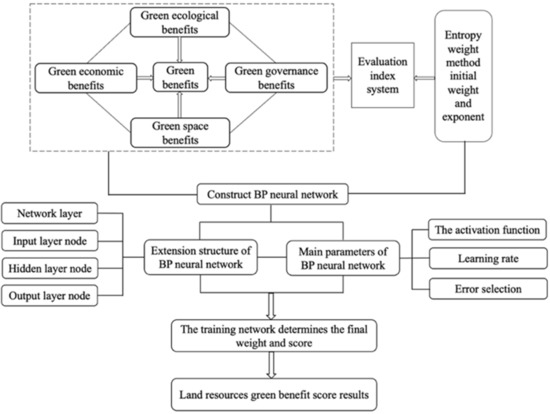 Over the past 20 years, China has continuously strengthened the restoration of its ecosystems and has achieved remarkable ecological results in forest, grass, and wetland areas, making contributions to global ecological security and sustainable development [24]. Many previous studies evaluated land use changes and their associated benefits and more mature theoretical methods have been developed in terms of index system construction and quantitative analysis, such as the analytic hierarchy process (AHP), the input–output analysis (DEA) and land system dynamics. With the development of a complex network system, some scholars have considered land use/land cover as a human–environment system, which is an important factor in terms of constructing a conceptual model of a land system [25], the introduction of the neural network model for the regional development level [26], sustainable development [27] and land suitability evaluations [28], cultivated land quality evaluations [29], etc. The research methods present a trend from a single method to a comprehensive application of multiple methods [30]. Green development is a model that emphasizes the interaction between the economy and the environment [31], including three first-level indicators of the green development degree of economic growth, resource and environmental carrying capacity, and government policy support, and nine second-level indicators of green growth efficiency, resource abundance and ecological protection, and green investment. Additionally, there are 62 third-level indicators of a green development index system, including the regional total output value per capita, forest coverage rate, and urban per capita green area. [32]. An “object-subject-process” framework system for global green development can be constructed under the framework of the Sustainable Development Goals (SDGs) [33]. The land use type and efficiency reflect the level of intensive resource utilization and ecological and environmental protection, leading to differences in the ecological and environmental effects which will affect the construction of regional ecological civilization and the level of green and high-quality development [34,35]. Eventually, this will significantly affect the surface CO2 concentrations [36]. Nowadays, land use change and its ecological, environmental problems should be measured from the perspective of ecological civilization construction and green and high-quality development [37]. The green development of land use should strengthen our understanding of the resources, capital, and assets of land systems, and help us to better grasp their ecological services, ecological assets, multi-functional landscapes, and ecological security [38]. Some scholars have also used the Theil Index and spatial Markov chain to measure the spatial patterns and to analyze the evolution of green development efficiency in Chinese cities from 2005 to 2015. Based on the above methods of assessing the land use change, this paper uses the entropy weight method and BP neural network method for research and constructs the entropy weight–BP neural network model of green land use benefits. The initial result calculated by the entropy weight method was used as the input of the BP neural network, where the connection weight between each layer was learned by the neural network and the weight was calculated, making the results of the land resource green benefits more scientific and objective [39]. Existing studies have mostly evaluated and analyzed land use change and its benefits, and the ecological and environmental effects, etc.; however, it is necessary to further promote the comprehensive evaluation of green development and land use benefits to provide a theoretical basis for rationally optimizing land use and promoting green development in land management.