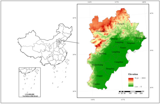 The Beijing–Tianjin–Hebei region is located at 36°01′~42°37′ N, 113°04′~119°53′ E, bordering Bohai Bay in the east, Shanxi province in the west, Inner Mongolia in the north and Shandong province and Henan province in the south. The total area is 213,600 square kilometers, accounting for 2.3% of China’s territory. The specific geographical location of the Beijing–Tianjin–Hebei region is shown in Figure 2. The terrain is mainly mountainous and plain, with Taihang Mountain in the west, Yanshan and Bashang Plateau in the north, and Haihe plain in the remainder. Specifically, Beijing is dominated by mountainous areas, accounting for about 62% of the area. Tianjin is dominated by plains, which account for more than 90%. Hebei province consists of the Bashang Plateau, Yanshan, Taihang Mountain and Hebei plain, accounting for 8.5%, 48.1% and 43.4% of the total area of the province, respectively.