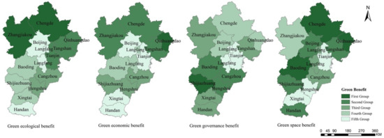 As can be seen from Table 2, there were obvious regional differences in the green land use benefits in the Beijing–Tianjin–Hebei region, presenting a spatial pattern of high green land use benefits in the north, low green land use benefits in the middle, and high green land use benefits in the south. The green efficiency index of Hebei province was higher than that of Beijing, and that of Beijing was higher than that of Tianjin. Chengde and Zhangjiakou in the northern region had the highest green efficiency index of more than 0.5, mainly because of their rich forests, grasslands, wetlands and water resources, high forest coverage rate, low land development and utilization rate, and high agricultural output. The green benefit index of Tangshan and Qinhuangdao was 0.45 and 0.49, respectively, mainly due to high levels of agricultural products output, high forest coverage rates, low utilization rates of land development and built-up areas, which made their green economic benefits and green space benefits levels higher. Baoding, Shijiazhuang, Cangzhou and Hengshui had a green efficiency index between 0.32 and 0.39. These four cities are in the southern part of the region, and their green economic benefits are limited; however, urban green governance and an improvement in the spatial environment were relatively good. In Handan, Xingtai and Beijing, the green benefit index was between 0.26 and 0.31, mainly because the total population is relatively large and the ecological benefit and agricultural output was very limited. The green benefit index of Langfang and Tianjin was the lowest, between 0.23 and 0.25, mainly because the total population is relatively large, the per capita level of forest, grass, wetland, and arable land was limited, the output of green agricultural products was not high, and the green governance and green space benefit levels were low.