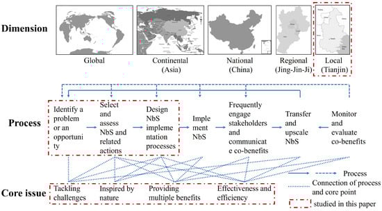 Cities are facing challenges such as climate change, ecosystem destruction, and impeded sustainable city development. Researchers have proposed solutions based on nature to address such challenges in an ecologically adaptive manner. One of the most effective solutions currently available is the nature-based solution (NbS) [1,2]. Biomimicry is a prototype for NbS applications [3]. During the late 2000s, the term “natural-based solutions” emerged [2], and was mentioned in an official document issued by the World Bank in 2008 [4]. The International Union for Conservation of Nature (IUCN) defined NbS as “actions to protect, sustainably manage, and restore natural or modified ecosystems, that address societal challenges effectively and adaptively, simultaneously providing human well-being and biodiversity benefits.” [2]. The European Commission (EC) defined NbS as “actions inspired and supported by nature, which are cost-effective, simultaneously provide environmental, social, and economic benefits and help build resilience.” [5]. The IUCN and EC definitions of NbS represent different perspectives. The IUCN’s definition of NbS aims at ecologically sustainable development, whereas the EC’s definition of NbS integrates social, economic, and environmental co-development. EC extended the definition of NbS based on that of the IUCN, which was reflected in the reconstruction of an opposing relationship between society and ecology and socio-ecology vantage point. This also set the foundation for NbS research of follow-up researchers who focused on the interrelationship between humans and nature. Sowińska-Świerkosz and Garcia (2022) proposed the ideas that the integration of blue-green elements is a key criterion of NbS, and hybrid green-blue-grey intervention can also be regarded as NbS to achieve enhanced efficiency and affordability [6]. Ma et al. (2022) mentioned that NbS should mitigate climate change, enhance the ecological environment, and protect biodiversity to achieve a win–win scenario [7]. NbS has been under development for decades; however, its theoretical underpinnings require further refinement. Scholars have further contributed to the core issues and holistic framework of NbS [6,8] to assist future NbS research advancement according to a defined set of processes (Figure 1).