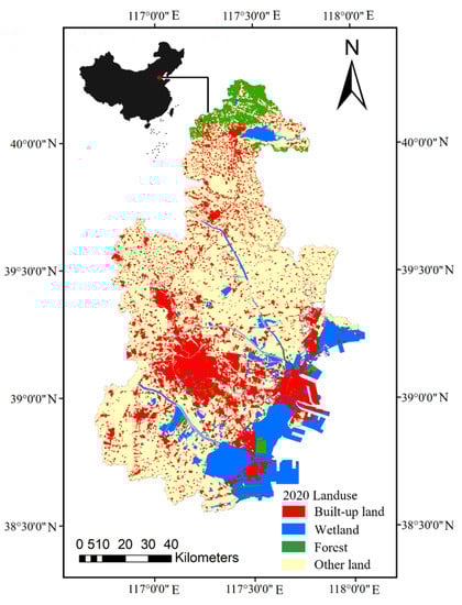 Tianjin (116°43’–118°04’ E, 38°34’–40°15’ N) is in North China. It is one of the core cities of the Beijing–Tianjin–Hebei urban agglomeration, covering an area of 11,966.45 km2 (Figure 2). Tianjin has a warm temperate humid monsoon climate, with an annual mean temperature of 14 °C and a low annual total precipitation of 360–970 mm. Tianjin’s rainfall occurs mostly in the summer, and the city is also prone to flooding. The terrain mainly consists of plains and depressions, with low hills to the north. Overall, the elevation gradually decreases from north to south, with the highest elevation in the north, at an altitude of 1052 m. The lowest elevation is in the southeast, at an altitude of 3.5 m. Forest-linked resources in Tianjin are scarce, but an increase in the forest cover has been apparent. The first national forest inventory (1949) revealed that the forest cover of Tianjin was 2.1%; however, it has increased to 12.01%, as of 2018. In terms of water resources, Tianjin is rich in water systems, and these systems include viable wetland resources. The Da Qing River, South Canal, North Canal, Ziya River, and Yongding River converge in Tianjin. However, as a consequence of rapid urban development, the wetland coverage experienced a steep decrease. At the beginning of the 20th century, the wetland coverage in Tianjin was approximately 45.9%, and it dropped to 8.5% in the 1970s [19]. With ecosystem protection now being prioritised, wetlands have been gradually restored. The Second National Wetland Inventory (2013) showed that the wetland coverage reached 24.70%. However, this number is still far from the initial coverage area. Forests and wetlands are considered NbS for sustainable city development, but overall, these ecological resources exhibit different spatiotemporal dynamics. Therefore, a study on the changes of synergistic patterns of forests and wetlands, using Tianjin as a study site, can provide a scientific basis for the strategic formulation of two variables NbS.