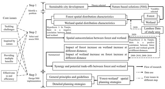 Nature-based solutions are some of the most effective strategies to promote sustainable city development; however, existing research on NbS is mostly comprised of single variable studies rather than multiple variables. The purpose of this study was to explore the possibility of extending the NbS of a single variable to two variables for the better development of sustainable cities. Both forestation and wetland restoration are regarded as NbS for sustainable city development. The research approach of “forest–wetland” NbS was proposed and centers on the process and core issues of traditional NbS. Taking Tianjin as an example, the spatial patterns of forests and wetlands, correlation between the spatial distribution of forests and wetlands, and spatial correlation between the areas of forest growth and wetland growth within a certain distance in different years were studied using a spatial distribution pattern analysis, geographic concentration analysis, kernel density estimation and spatial autocorrelation analysis. Based on the core issues of NbS and the above spatial analysis, a “forest–wetland” spatial planning strategy was formulated. The main conclusions are as follows: forest and wetland were negatively correlated in the whole area of Tianjin, forest resources w mainly located in north, while wetland resources were mainly located in south. Compared with forests, the spatial distribution of wetlands in Tianjin was more balanced. There exist synergy and trade-offs between forest and wetland area under certain circumstances. Growth of forests was positively correlated with the growth of wetlands, within a distance of 0–400 m from 2000 to 2010, and within a distance of 0–600 m from 2010 to 2020. An increase in forest area will lead to an increase in evaporation, which in turn will hinder the growth of wetlands in Tianjin. Forest–wetland ecological network could promote synergistic between forest and wetland, and grey infrastructure to reduce potential trade-off between forest and wetland.