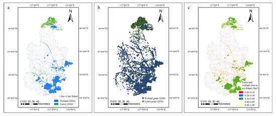 The forest/wetland spatial data in Tianjin (2020) (a), point features of forest/wetland in Tianjin (2020) (b), forest and wetland area in per fishnet (c).