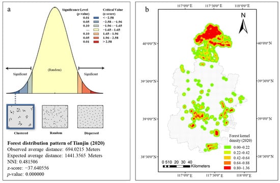 Forest distribution pattern of Tianjin (2020) (a), forest kernel density of Tianjin (2020) (b).