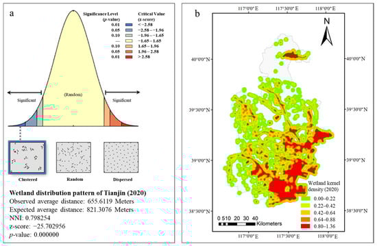 Wetland distribution pattern of Tianjin (2020) (a), wetland kernel density of Tianjin (2020) (b).