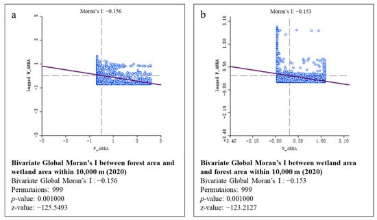 Bivariate Global Moran’s I between forest area and wetland area within 10,000 m in Tianjin (2020) (a), Bivariate Global Moran’s I between wetland area and forest area within 10,000 m in Tianjin (2020) (b).