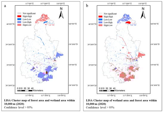 LISA Cluster map of forest area and wetland area within 10,000 m in Tianjin (2020) (a), LISA Cluster map of wetland area and forest area within 10,000 m in Tianjin (2020) (b).
