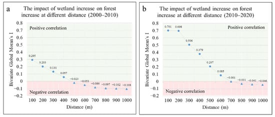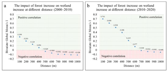 Geoda software (1.18.0) was used for a Bivariate Global Moran’s I index analysis (Spatial Analysis—Bivariate Global Moran’s I). The forest and wetland growth areas within their respective unit were calculated as first and second variables. The impact of forests on wetlands increased at different distances, as illustrated in Figure 9. Figure 9a illustrates that the growth of forests was positively correlated with the growth of wetlands within a distance of 0–400 m from 2000 to 2010. This indicates that as the forest area increased, the area of wetlands surrounding the forests also increased. When the distance exceeded 500 m, the growth of the forest area was negatively correlated with that of the wetland area. This indicates that as the forest area increased, the wetland around the forest showed a decrease. Figure 9b shows that the growth of forest area was positively correlated with the growth of wetland area, within a distance of 0–600 m, from 2010 to 2020. When the distance exceeded 700 m, the growth of the forest area was negatively correlated with that of the wetland area.
