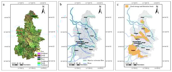 Rainwater flow direction of Tianjin (a), flow accumulation of Tianjin (b), flood storage and detention basins of Tianjin (c).