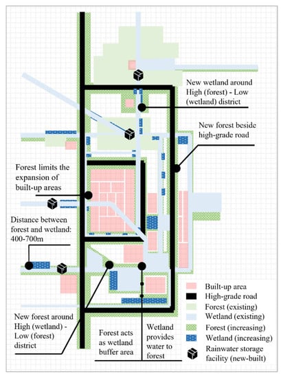 - On the one hand, the number and area of wetlands should be increased, and on the other hand, sufficient space and basic conditions for wetland development should be set aside. Increasing the number of wetland patches should be based on current water systems. Combined with forest construction, forests should be used as an ecological buffer for wetlands to guarantee the conservation and restoration of wetland ecosystems, which could protect and enhance water quality [32]. The optimal distance between the forest and wetland should not be more than 400 m.
