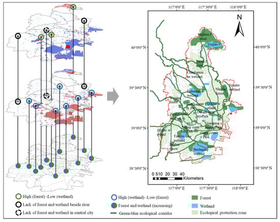 The results revealed that forests and wetlands were concentrated in the north and south of Tianjin, respectively. Tianjin lacks wetlands in the north and forests in the south, while the central city of Tianjin lacks both forests and wetlands. Therefore, spatial planning strategies should increase the number of wetlands and forests in accordance with the resource-linked features of each region. As per the macro spatial autocorrelation between forests and wetlands in Tianjin, certain high–low districts have great potential to develop forests and wetlands. Therefore, priority should be given to expanding forests and wetlands around the high–low districts. Meanwhile, the micro-spatial autocorrelation between forest and wetland at different distances demonstrates that the synergistic effect of forests and wetlands mainly exists at a distance of 0–400 m. When ecosystem conditions improve, the distance can be extended from 0 to 700 m. In the spatial planning strategy, new forests/wetlands should be adjacent to wetlands/forests to maximise their synergistic effect (Figure 13). Based on the above factors, a forest–wetland ecological network was established to fill the gap between the current forests and wetlands of Tianjin and to promote synergy between them.