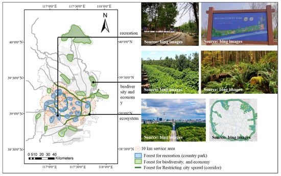 The forest–wetland ecological network promotes synergy between two ecological resources, even though this network performs only a single function (i.e., improving ecosystem quality). However, good NbS requires multiple benefits. Therefore, other factors must be included in the construction of forest wetlands. Taking forestation as an example (Figure 14), the new forests around the central city are mainly positioned as country parks, such as the Xiqing Country and Northern Country Parks. The 10 km service scope covers more than 70% of the central city, which can offer public spots for leisure and entertainment. The forests on the fringes of the central city, such as Jizhou, Jinghai, and Ninghe forests, can be intercropped with vegetation to improve biodiversity and agricultural income [7]. The forest next to the expressway constitutes the green–blue ecological corridor, which mainly plays the role of limiting the sprawl of the urban built-up area. Integrating different types of forests produces more benefits, such as recreation, biodiversity, and economy, in addition to their ecological advantages.