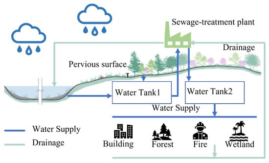 - Based on the hydrological analysis and distribution of flood storage areas, new rainwater harvesting measures were proposed. In combination with the “Forest–Wetland” spatial planning strategy, rainwater should be harvested during periods of abundance to reduce the impacts of urban flooding [33]. Accordingly, rivers should be recharged during periods of water shortage to ensure that the ecological environment uses water for natural restoration.