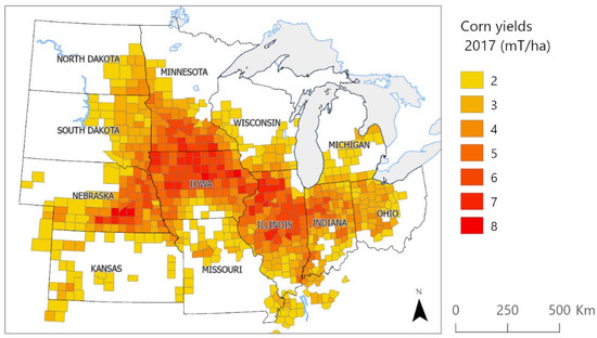 Other factors beyond climate, such as soil conditions, topography, or water bodies, influence the distribution of crop production, but in this region, climate is a key driver [1,3,10]. Wet soils and shallow wetlands have largely been managed or eliminated by field drainage. Inputs, especially fertilizer, adjust for variations in soil quality. Many aspects of environmental variation, then, have been controlled in this environment. Climate conditions can also be accommodated, in that both drought and extreme heat can be mitigated by irrigation. However, a key historical advantage to production in this region has been the ability to produce high yields without irrigation. Climate conditions have thus been an economic advantage to production.