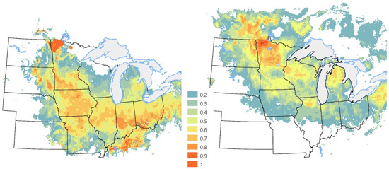 While the human impacts of geographic changes in corn production have received close attention, fewer studies have examined the impacts of a northward-shifting Corn Belt on non-human ecosystem values and services, such as biological diversity. The biodiversity in the remnant grasslands, shrublands, and herbaceous wetlands in the region, in particular, provides critical breeding habitat for migratory grassland and wetland birds, as well as supporting invertebrate and floral diversity [17,18,19,20]. Despite over a century of cultivation, the upper Midwest supports much of the Western Hemisphere’s migratory waterfowl population, as well as prairie songbirds and upland gamebirds that persist in fragments of remnant grassland, herbaceous wetland, and shrubland habitat [20,21,22].