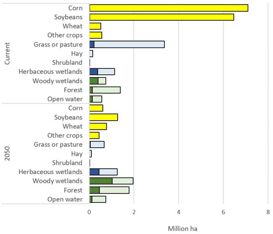 In future-suitable areas, one-third of the landscape was in cultivation (32 percent). Corn made up only 6 percent of land cover, with soybeans (13 percent), wheat (8 percent), and other crops (5 percent) comprising the rest. Grass, pasture, and hay together made up 21 percent of the landscape. Woody wetlands (20 percent), forest (19 percent), and open water (8 percent) made up the rest of the landscape.
