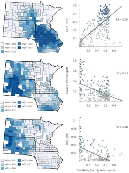 Distribution of corn (top), grassland + pasture (center), and hay (bottom), aggregated by county (left), and plotted against county mean suitability value (right). Values are given as a fraction, where total land cover = 1.0.