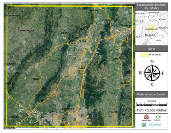 The study area was the northern peri-urban or urban-interface area of Bogotá, Colombia (Figure 1). The country of Colombia is also shown, for reference, in Figure 2. The study area also included the eastern Andes mountains and accounted for several land use cover and ecosystem types, located in both mountainous areas and a high elevation plain within the study area. The elevation ranged from 2600 m to 3500 m above sea level. Precipitation varied from about 600 mm per year to 1200 mm per year and had an annual average temperature of 14 °C [32]. The study area included the urban land use and land cover city of Bogotá as different administrative areas and sociodemographic characteristics, as well as the peri-urban areas that surrounded the city, covering an area of approximately 1075 km2 [42]. The city of Bogotá and its surrounding communities within the study area had approximately 7.5 million inhabitants [43]. The study area was one of the country’s key regions for agricultural and industrial production [44]. The area used for the online survey instrument in Section 2.3 extended from coordinates −74.21 latitude (lat), 5.02 longitude (long) to −73.91 lat, 4.73 long.