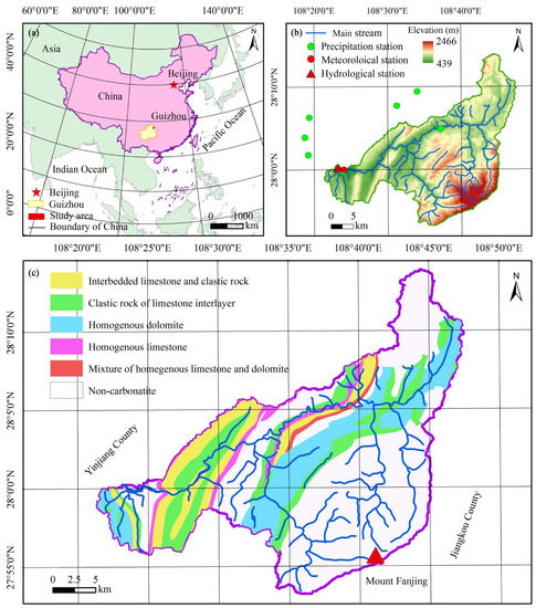 The monthly rainfall (P) data of 8 rainfall observation stations and the monthly runoff (Q) data (long data from January 1984 to December 2015) at the hydrological station were collected from the Guizhou Provincial Hydrology and Water Resources Bureau (http://www.gzswj.gov.cn/hydrology_gz_new/index.phtml) (accessed on 15 September 2016). The monthly evaporation (E) data (January 1984 to December 2015), which were also derived from the Guizhou Provincial Hydrology and Water Resources Bureau, were measured by the evaporation dish of the hydrological observation station and represented the water evaporation of the water surface or soil. The monthly temperature (T) data of the weather station corresponding to the runoff time series were obtained from the China Meteorological Data Sharing Service System (http://cdc.cma.gov.cn/) (accessed on 5 August 2021). The average annual rainfall data for the watershed were interpolated by the Kriging method with the annual rainfall data of all 8 rainfall stations (both inside and outside the watershed). The DEM data with a spatial resolution of 30 m were obtained from the International Scientific and Technical Data Mirror Site, Computer Network Information Center, Chinese Academy of Sciences, which could be downloaded from the Geospatial Data Cloud (http://www.gscloud.cn) (accessed on 12 September 2021). The lithology data were derived from the Karst Scientific Data Center (http://www.karstdata.cn/) (accessed on 12 September 2021), Institute of Geochemistry, Chinese Academy of Sciences.