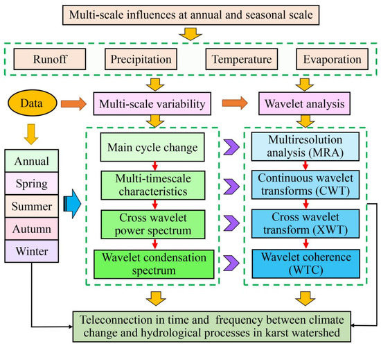 Karst landforms are developed in highly heterogeneous carbonate rocks that are easily eroded by flowing water, widely distributed in Southwest China and generally have different hydrogeological characteristics from non-karst areas [36]. Thus, the karst watersheds are characterized by broken surfaces, low runoff coefficients, serious underground leakage, thin surface soil and poor regulation and water conservation capacities [37,38,39,40]. The unique two-dimensional/three-dimensional hydrogeological structure can accelerate the hydrological process [41,42]. In particular, rainfall drains rapidly to underground systems through numerous cracks and fissures [40,43,44,45,46]. The soil–epikarst system plays important roles in runoff generation due to the large storage capacity and high infiltration rate of karst carbonate fissures and fractures [2]; consequently, runoff changes in karst areas are sensitive to climatic factors, and small climatic fluctuations will cause large fluctuations in runoff. The appearance, storage and circulation of water in karst aquifers are apparently different from those of water in non-karst areas. The special hydrological process in karst areas will lead to the influence of climate change on runoff with time lag or advance at different time scales. In addition, the hydrometeorological evolution in karst areas has obvious seasonal and multi-scale characteristics. Significant differences exist in the evolution and influence relationships at different scales, especially the intrinsic relationship between monthly and seasonal rainfall, evaporation, temperature and runoff; their vibration energy distribution characteristics and correlations in time and frequency domains are extremely complex. Numerous studies have focused solely on non-karst watersheds. On the contrary, the impacts of climatic factors on runoff (surface runoff) changes have rarely been identified for karst watersheds. Specifically, the research on the time-varying characteristics of climate and runoff and their coupling relationship in karst trough valley watersheds is scarce. Therefore, the objectives of this study are to (1) analyze the multiscale temporal variability effects of runoff with climatic factors, (2) characterize the coupling relationship between runoff and climatic factors in common high- and low-energy regions and high-correlation regions at different time scales and (3) provide a theoretical basis and technological support for water resource safety management in karst watersheds.