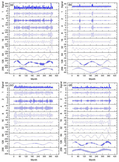The main aim of this section is to visualize the distribution of energy across scales (or resolution levels) of the hydrogeological time series. The MRA was performed on monthly data, and the results for the first 10 MRA levels are shown in Figure 3. Overall, the energy is distributed variably across levels in the hydrogeological time series and has significant periodic characteristics in different time scales, especially at a large scale. Runoff and rainfall show high energy oscillation at all levels, but they fluctuate with time, which indicates that the high-energy differences in monthly runoff and rainfall explain most of the differences. The energy vibrations at all time scales have a high consistency, and the vibration consistency is significant at a large scale, which demonstrates that runoff is significantly affected by rainfall. Evaporation shows high-energy vibrations at all time scales. Evaporation oscillation that gradually diminishes at 16-, 32- and 64-month time scales, however, is consistent with runoff and rainfall at 128- and 256-month time scales. Several obvious abrupt changes are detected from temperature in the vibration characteristics of 1 month to 4 months with the mutation years of 1990 (70-month) and 2000 (200-month) according to energy distribution. The oscillation characteristics of temperature are consistent with those of runoff and rainfall at time scales of 16, 64, 128 and 256 months. After 128-month time scales, the oscillation characteristics of runoff, rainfall, evaporation and temperature all appear to have the same vibration characteristics at 10–20-year time scales.