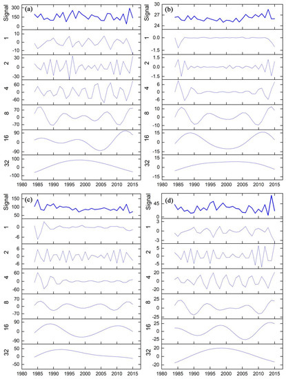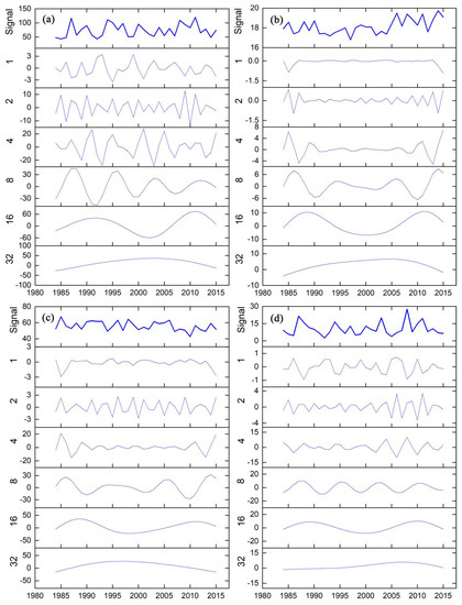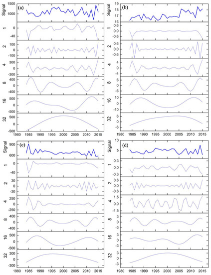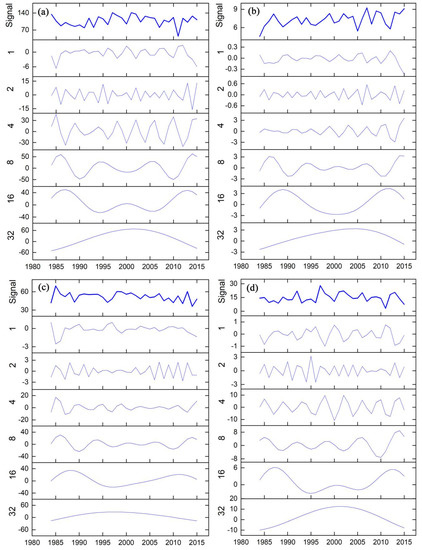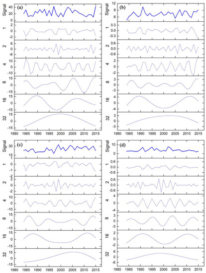 As shown in Figure 4, Figure 5, Figure 6 and Figure 7, there are some synchronization characteristics on different time scales for the evolution characteristics of surface runoff and climate factors on the annual scale and four seasonal scales after scale segmentation by MRA. Except for the small difference in runoff in autumn and winter, the evolution characteristics of runoff at other scales are basically synchronous, especially in summer. The amplitude of rainfall oscillation at each time scale is larger than that of runoff, but a minimal difference exists between them in spring, autumn and winter. Evaporation is asynchronous with temperature for the variation characteristics at 1-year scale in spring and winter and at less than 4-year scale in summer but relatively synchronous with insignificantly different amplitudes at other scales. Over 16-year time scales, the time series of each factor has shown the consistent evolution characteristics in four seasons and the amplitude of each factor increases with the increase in time scale.