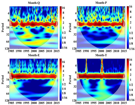 The monthly temperature is close to the monthly evaporation periodic bandwidth without interruption (Figure 9—Month T), which reflects the global and significant periodic variation characteristics of the monthly temperature and evaporation and indicates that the monthly temperature may affect the runoff mainly by changing the monthly evaporation. The monthly temperature has significant high-energy characteristics in the time domain around 1990 and 2000. The energy is strong at high frequencies below the scale of 1–8 months and weak at low frequencies after 8 months, but the periodic bandwidth increases with the scale.