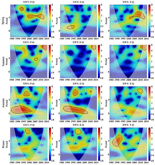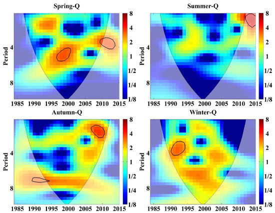 As can be shown in Figure 10 and Figure 11, runoff in spring has a main cycle at 4–6 years (1995–2000) and a subcycle at 1–2-year time scales (1990–1997). Runoff in summer is an insignificant period on the 4-year time scales (1990–2000). There are global insignificant characteristics for the main period of runoff in autumn at 1–2-year time scales (2006–2010) and the subperiod at 7-year time scales (1993–2005).