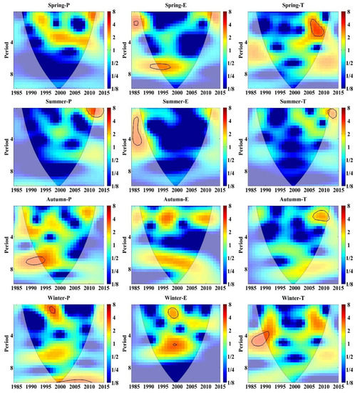 The continuous wavelet power spectra of seasonal rainfall, evaporation and temperature in Yinjiang River watershed. The thick black contour designates the 5% significance level against red noise and the cone of influence (COI) where edge effects might distort the picture is shown as a lighter shade.