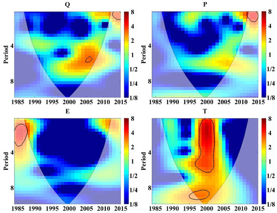 The continuous wavelet power spectra of monthly runoff (Month Q), rainfall (Month P), evaporation (Month E) and temperature (Month T) in the Yinjiang River watershed. The thick black contour designates the 5% significance level against red noise and the cone of influence (COI) where edge effects might distort the picture is shown as a lighter shade.