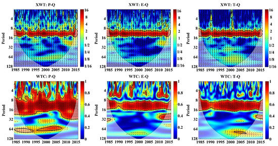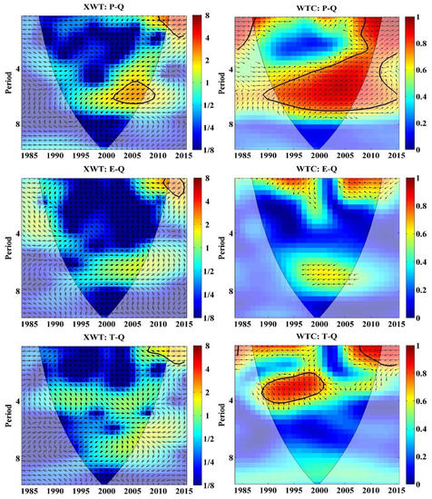 WTC between runoff and rainfall, evaporation and temperature on monthly scale. The thick black contour designates the 5% significance level against red noise and the cone of influence (COI) where edge effects might distort the picture is shown as a lighter shade. Arrows denote relative phase difference: The arrows from left to right indicate that the influencing factors and runoff are in the same phase, which implies a positive correlation; the arrows from right to left indicate an inverse phase, which implies a negative correlation; the downward arrows indicate that the influence factor is 90° ahead of the runoff change and the upward arrows indicate that the influence factor is 90° lagging the runoff.
