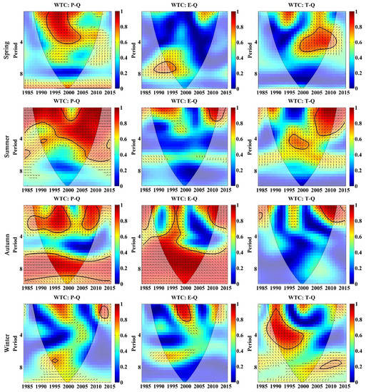 The effect of temperature on runoff also has significant high-energy regions in the four seasons. The power spectrum value is high, and the influence is strong in spring and winter. The influence of temperature in spring mainly concentrates on the main cycle at 4-year time scales from 2000 to 2014, and it is consistent with the influences of rainfall and evaporation on runoff at more than 6-year time scales. The effect of temperature on runoff changes mainly concentrates on the main cycles at 1-year time scale in summer and at 2-year time scales in autumn from 2007 to 2010. However, the effect of temperature on runoff in autumn has a subcycle at approximately 8-year time scales with high energy from 1995 to 2005, and it is similar to that of rainfall and evaporation at the same scale in the same time domain. The changes in temperature and evaporation in summer are ahead of runoff change, but the lead time of temperature ahead of runoff is greater than that of evaporation in summer. In addition, the effect of temperature on runoff changes in winter has a significant high-energy region at 4-year scale from 1990 to 1995, and that of rainfall and evaporation on runoff is stronger in the same time–frequency domain. Seasonally, the influence of temperature on runoff is similar to that of rainfall on runoff in the energy distribution in spring, which indicates that the increase in temperature results in increased rainfall and thus increases rainfall supply to runoff. In autumn, the influences of temperature, evaporation and rainfall on runoff have a consistent feature in energy distribution, which also shows that temperature has an important impact on evaporation and rainfall and leads to the same effect on runoff.